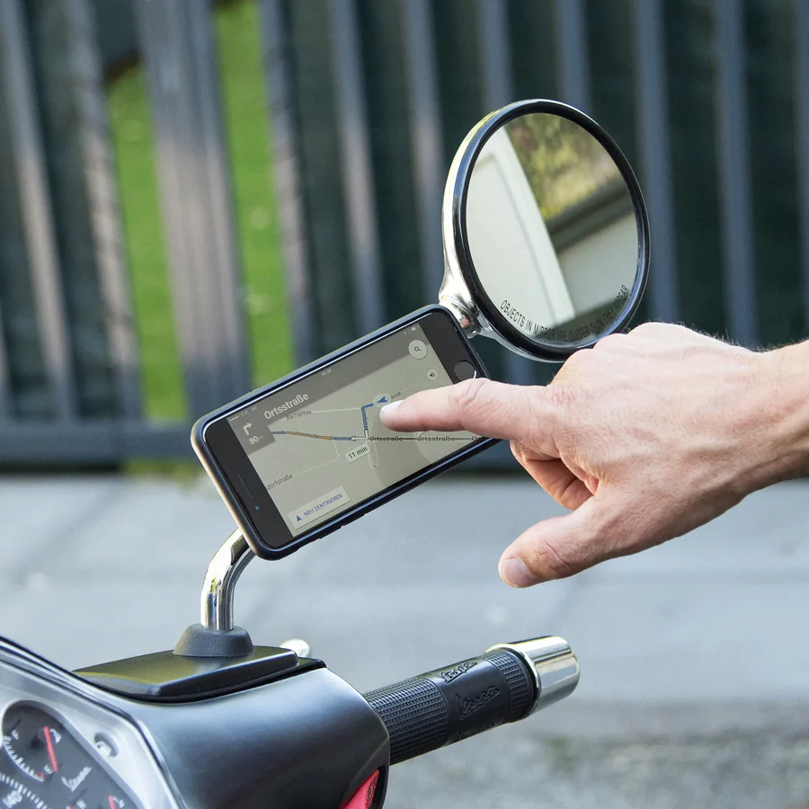 De Mirror Mount voegt een flexibele en intuïtieve spiegelhouder voor je mobiele telefoon toe aan je Vespa, Peugeot of andere scooters, bromfietsen en motoren